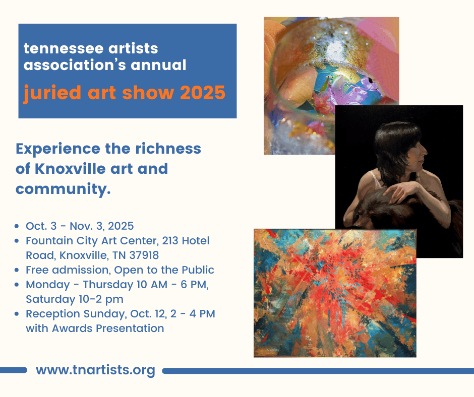 The Tennessee Artists Association is a place to learn and grow as an artist. Monthly programs of TAA include practical art demonstrations, discussions, and opportunities for individual artists to get involved in learning, community, and exhibitions. More about the Tennessee Artists Association can be found on the web at https://tnartists.org, on Instagram at @tn_artists, and on Facebook at TNArtistsAssociation.